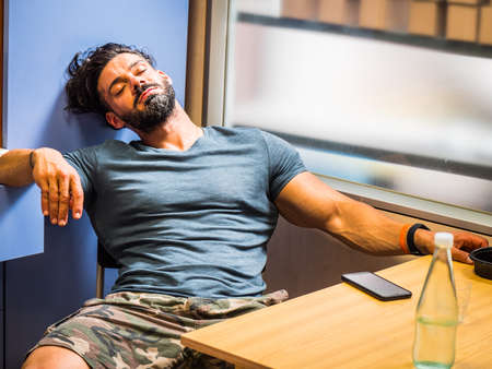 Man sleeping, sitting at a table in a train with a cup of coffee