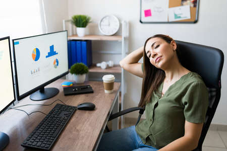 Freelance woman and sales representative suffering from neck pain for spending a lot of time sitting in front of the computer working