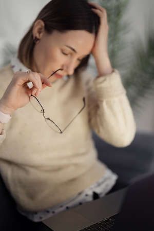 Portrait of a woman holding glasses with one hand and her tired head with others. Stress