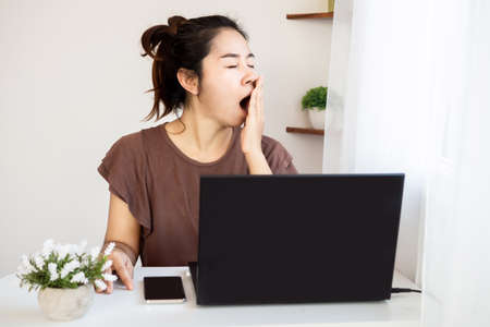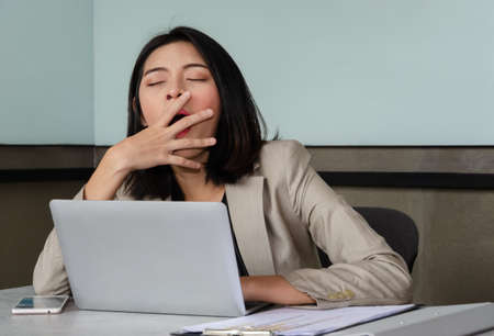 Young Asian business woman covering opened mouth with hand while yawning at meeting room in front of laptop, , feeling sleepy and bored. Overwork and sleep deprivation concept