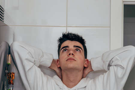 attractive man taking a break from working at home remote job concept medium shot indoors . High quality photo