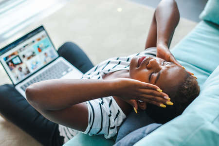 Computer technology. Office worker. Black businesswoman having a work problem.