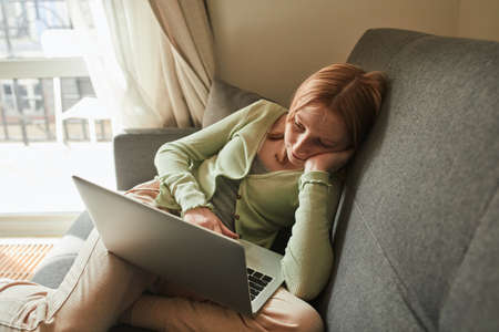 Beautiful young woman sleeping with head on laptop while lying on the couch at home
