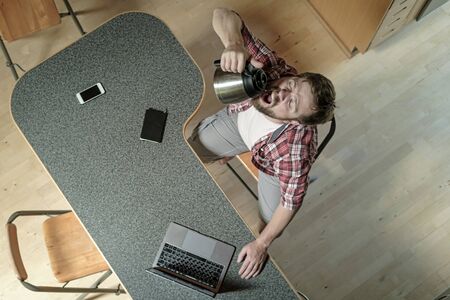 Man drinks coffee from a kettle, he is tired and overworked with a laptop, which lies on the kitchen table. Top view.