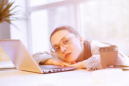 Overworked, Exhausted and tired young businesswoman removes glasses, resting, sleeping over a laptop in a desk at work in her office. she is overwhelmed by work, portrait shot. High quality photo