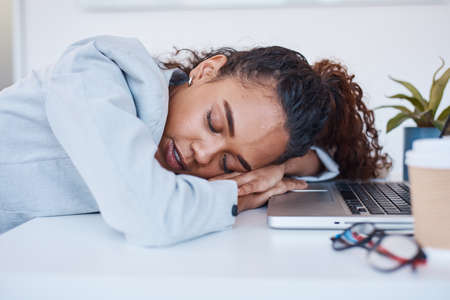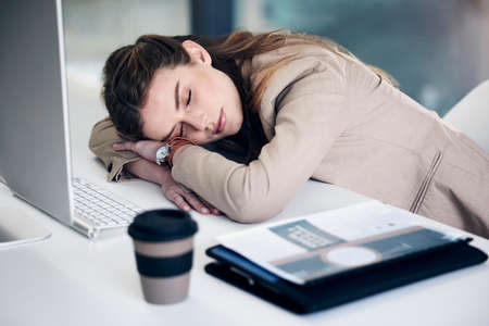 Too lazy to make success happen today. Shot of a young businesswoman sleeping at her desk in an office.