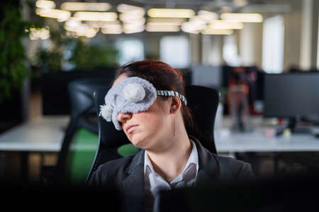Business woman in a mask blindfolded asleep in the office. Exhausted employee in the workplace