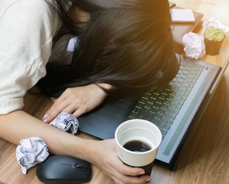 Young exhausted businesswoman lying on the table and sleeping in front of laptop computer she tired after hard work at office
