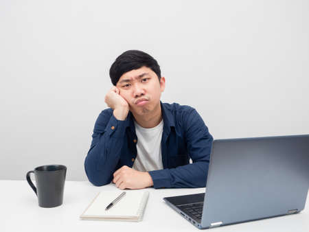 Hopeless business man resting on the office desk with frustation emotion and exhausted face.