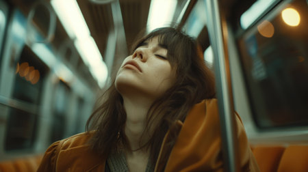 Portrait of a tired student girl sleeping on public transport, close-up. A woman who fell asleep at the window in a subway car. A passenger sleeping at the window of the train