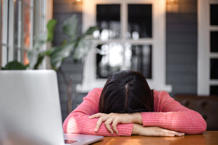 Exhausted employee sleeping on desk with head on arms, overwhelmed by stress and fatigue in modern office after working on laptop, highlighting need for better time management