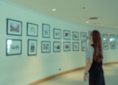 People looking at paintings on white wall in Art exhibition gallery. Blurry background.