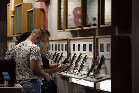 BELGRADE, SERBIA - SEPTEMBER 17, 2020: Young couple, lovers, man and woman, choosing a smartphone in a phone carrier shop wearing a respiratory face mask in Belgrade