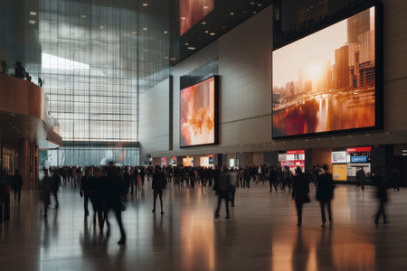 A spacious interior with many people moving, large screens showing cityscapes and abstract art.
