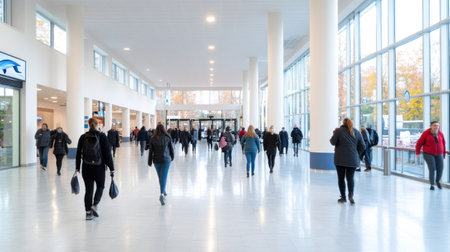 A bustling conference hall with a bright and airy atmosphere, featuring a waiting area and entrance hall with blurred businesspeople coming and going.