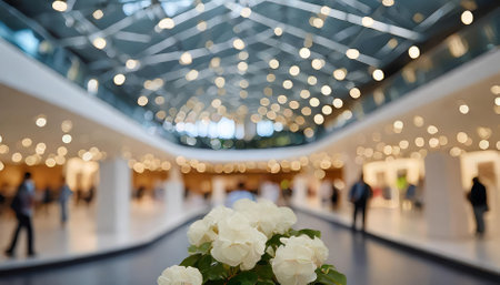 Event trade show expo background. Abstract blurred shopping mal-bokeh lights. Expo business booth stand