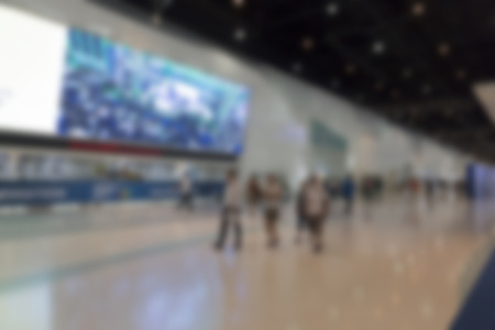 Blurry silhouettes of people walking in a business fair. Minimal business, work and selling concept. Copy space.