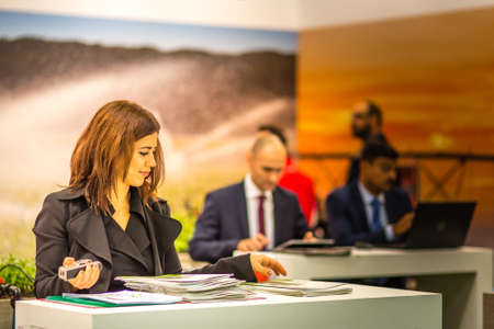BOLOGNA, ITALY – NOVEMBER 10, 2018: Booth presenter welcoming business visitors at EIMA 2018, International Agricultural and Gardening Machinery Exhibition