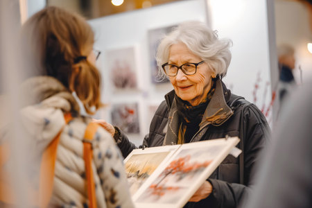 Elegant senior woman discussing her artwork with a potential buyer at an art exhibition, showcasing her talent and passion for painting