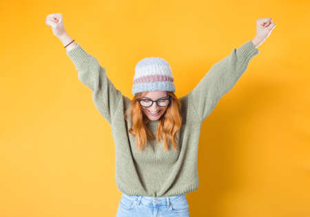 Joyful teenage girl with glasses and freckles, excitedly raises her arms in a victory pose