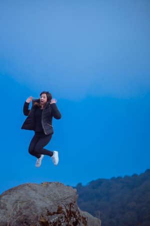 young man is jumping on top of the mountain