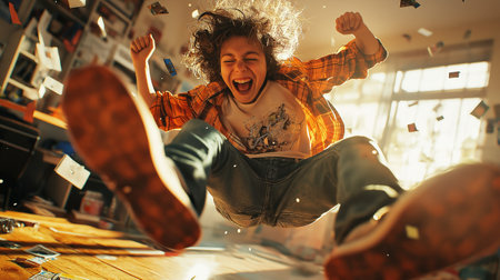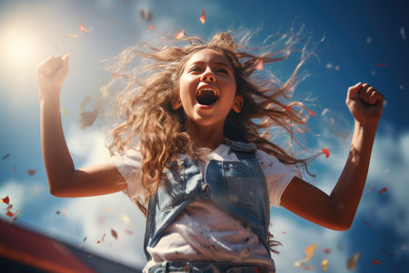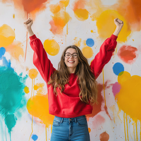 A vibrant young woman with curly hair beams with excitement, her arms raised in triumph against a playful background of colorful stars. This lively image radiates positivity and joy, capturing a moment of celebration and carefree happiness.