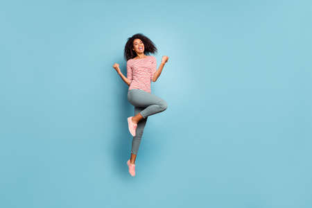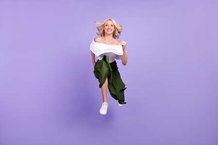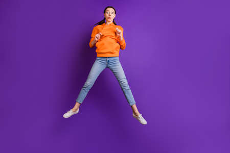 Full length body size girl jumping up running fast on sale in casual clothes isolated pastel purple color background