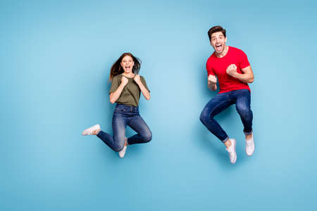 Full body photo of ecstatic two people spouses win lottery jump raise fists scream yeah wear green red t-shirt denim jeans sneakers isolated over blue color background