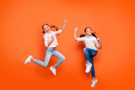 Full length photo of positive rejoicing two girlfriends jump rest relax win school sport competition raise fists wear white shirt denim jeans isolated over orange color background