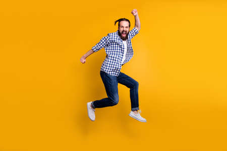 Full length body size view of nice funky crazy overjoyed cheerful bearded guy in checked shirt jumping up fooling having fun isolated over bright vivid shine vibrant yellow color background