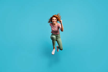 Full length photo of beautiful competitive lady jump high active rush speed marathon winner wear casual red white shirt green trousers footwear isolated blue color background