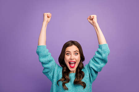 Photo of pretty crazy lady good mood raise fists open mouth yelling cheerleader fan support favorite sports team wear blue warm sweater isolated purple color background