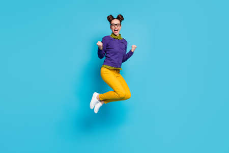 Full length profile photo of pretty crazy lady two buns jump high celebrate college graduating excellent degree diploma wear specs shirt pullover pants isolated blue color background