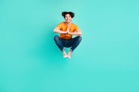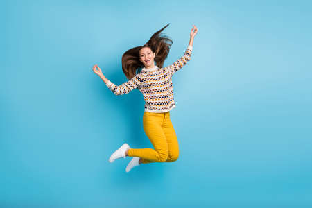Full length body size view of nice cheerful wavy-haired girl jumping having fun isolated over bright teal turquoise color background
