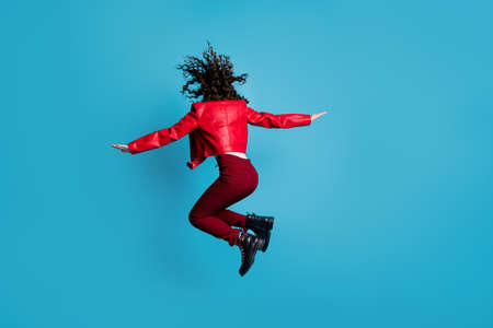 Full size back photo of hooray girl jump wear red jacket trousers boots isolated on blue background