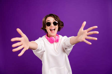 Photo portrait girl in sunglass keeping hands forward in headphones isolated bright pastel color background