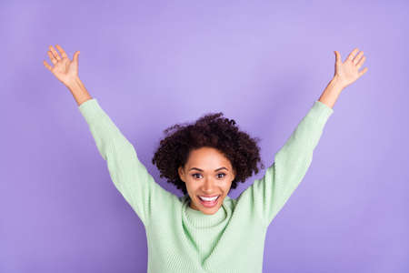 Photo of attractive young dark skin happy woman raise hands good mood enjoy isolated on purple color background