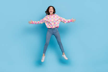 Full length photo of pretty adorable young woman dressed ornament pullover jumping isolated blue color background