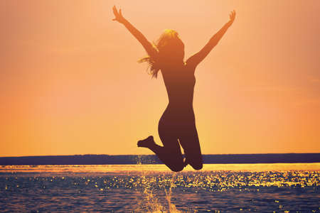 Silhouette of a beautiful, slim girl who jumps on a background of a sunset on the beach.