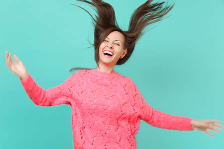 Joyful young woman in knitted pink sweater with fluttering hair spreading hands jumping isolated on blue wall background studio portrait. People sincere emotions lifestyle concept. Mock up copy space
