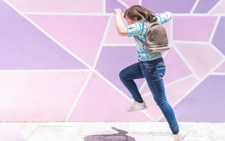 Blonde girl with backpack jumping in front of a pink and purple wall on the way to school