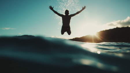 Man leaps into the ocean during sunset, creating a joyful splash near a tropical shoreline