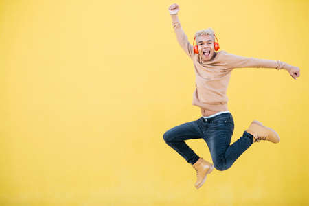 Portrait of Smiling Young man using red headphones and jumping Against yellow Background