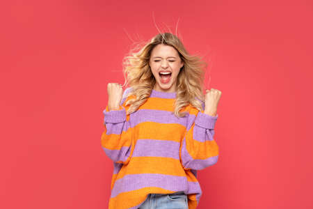 Crazy happy winner. Caucasian womans portrait. Beautiful female model in casual. Concept of human emotions, facial expression, sales, ad, copyspace. Bright, modern illustrated background. Flyer