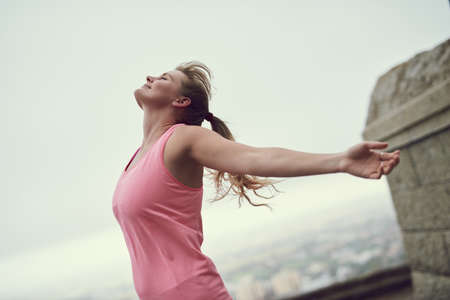 Nothing feels better than fitness. Shot of a happy young woman feeling free while out for a run in the city.