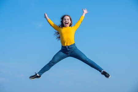 happy teen girl jump high on sky background. happiness