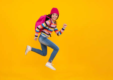Schoolgirl child student with backpack and warn hat, isolated yellow background. Learning and knowledge education concept. Crazy jump and run, jumping kids.