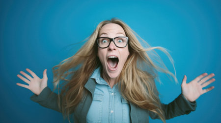 Excited and happy blonde smile caucasian woman. Facial expression. Real people emotions. A lot of copy space. Colorful studio background.