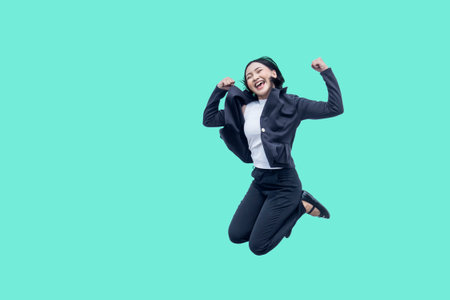 Excited Businesswoman Jumping in Joy Against a Vibrant Background