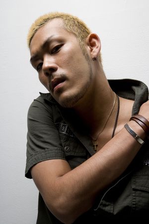 A stylish young Asian man shows off his fashion and tattoos against a bold orange backdrop.